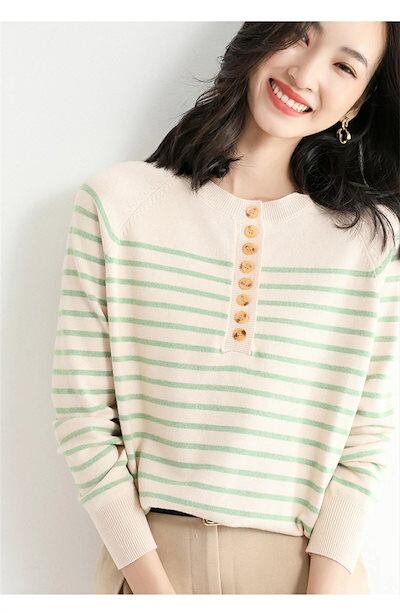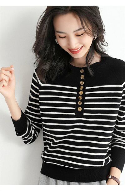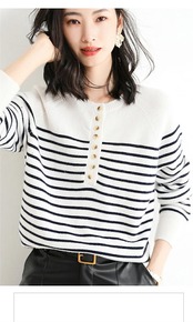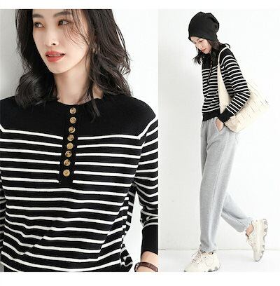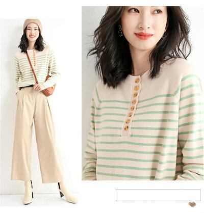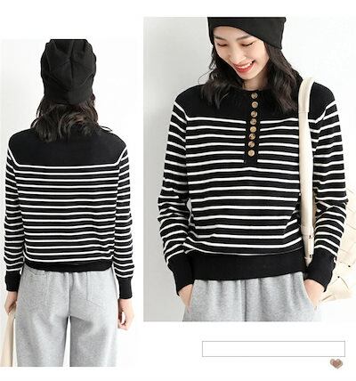 ニット トップス レディース セーター カットソー ニットセーター クルーネック ボーダー ニット プルオーバー 前開き インナー 長袖 秋 コーデ セーター ベーシック リブニット エレガント リブ | DOKO-ME