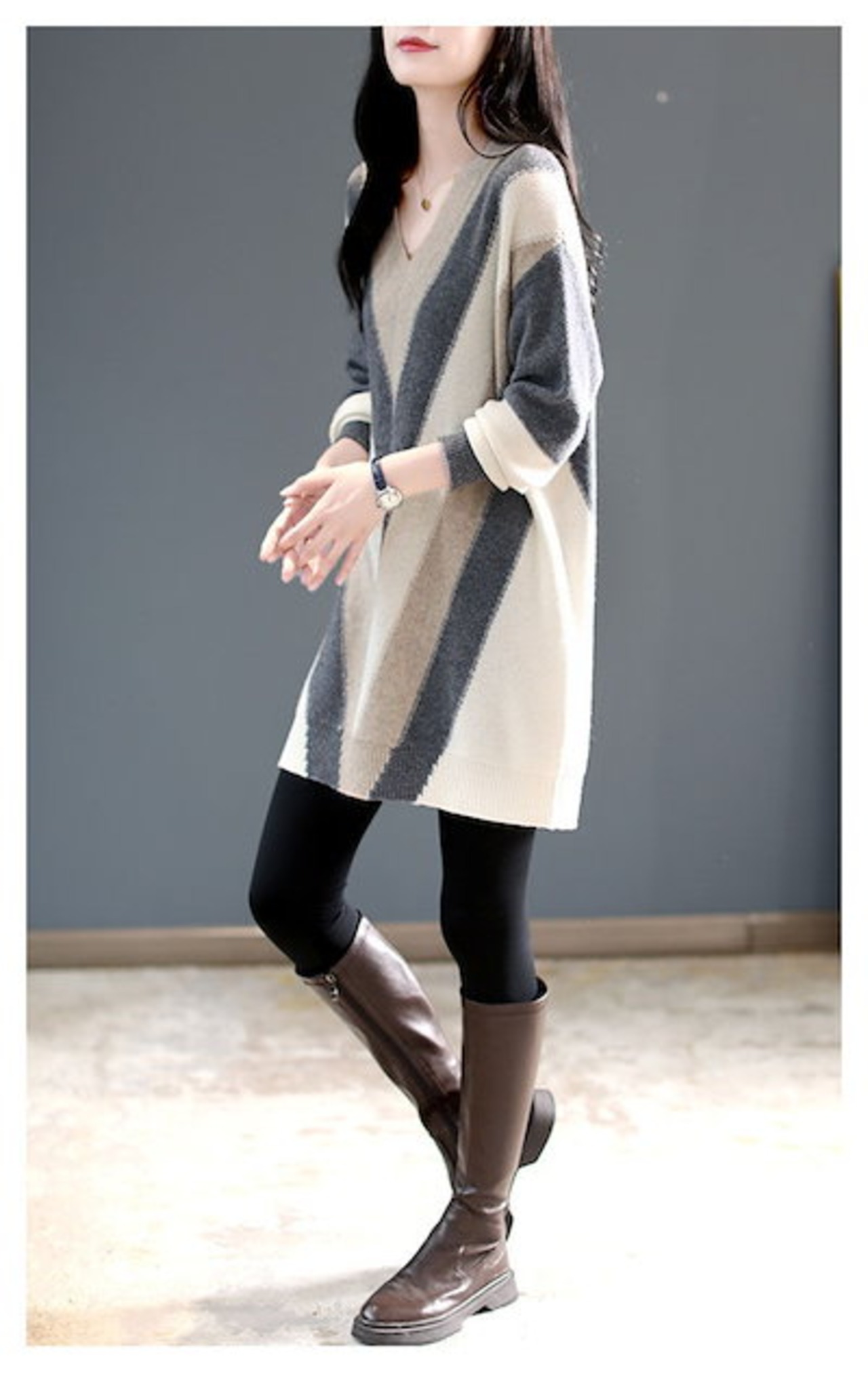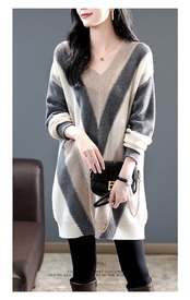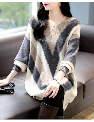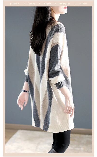 ニットセーターvネックゆったりワンピースレディースストライプ膝上丈体型カバーニットワンピースドルマンスリーブミドルゆったりロングセータープルオーバーセーターオーバーサイズ配色シンプルカジュアル重 | DOKO-ME