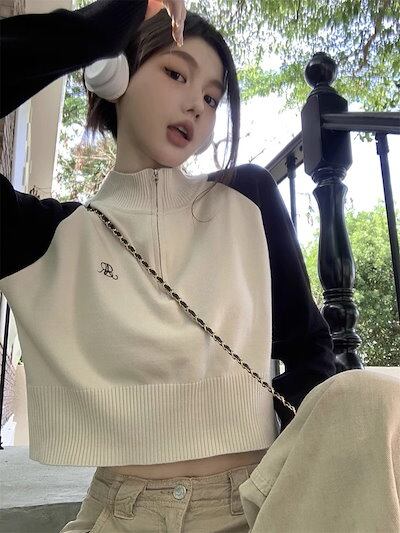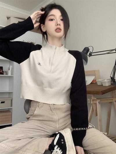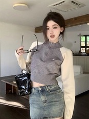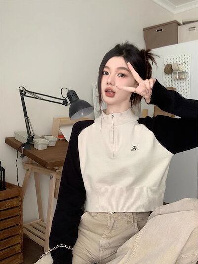 期?限定 トップス 長袖 ニット セーター レディース ショート おしゃれ カラバリハーフカラースタイルアップ 色っぽ 女っぽ カジュアル きれいめ 大人 ネック ファッション フェミニン 秋 冬 春 | DOKO-ME