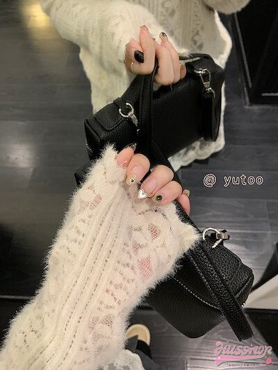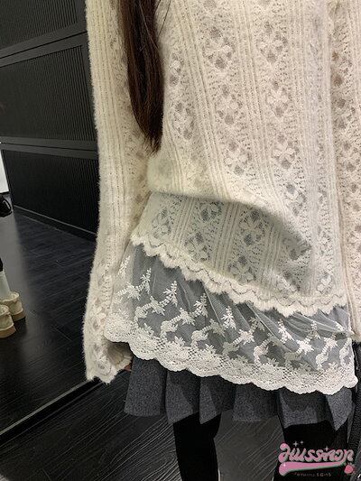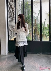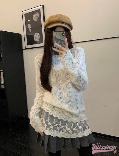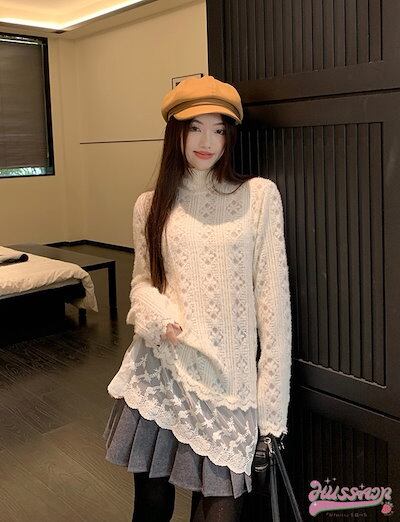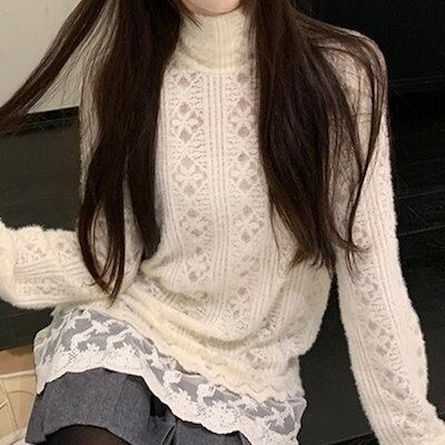 トップス Tシャツ レース 透かし彫り ハイネック 丈長め 長袖 スリム 細見え 秋冬 白 韓国ファッション レディース おしゃれ かわいい 甘め ガーリー キュート カジュアル お出かけ | DOKO-ME