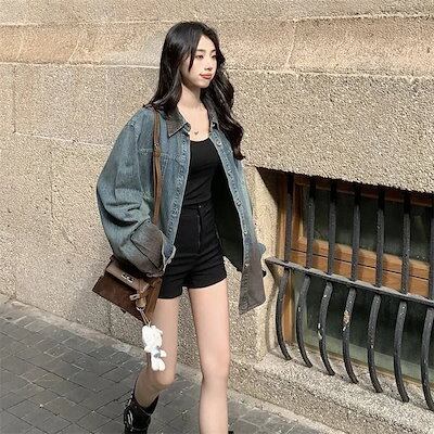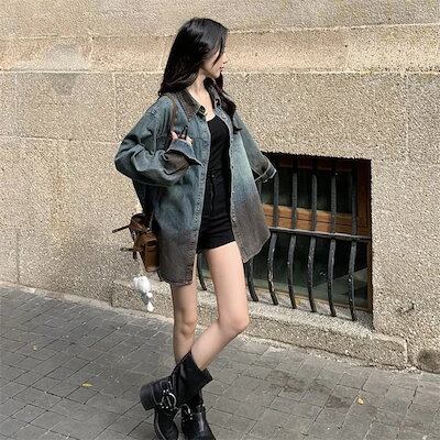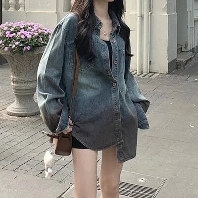 2024春夏トップス シャツ デニム生地 グラデーション ボタン 襟 グレー 長袖 春 ゆったり 丈長め かわいい おしゃれ 韓国ファッション レディース お出かけ30%までに制限 | DOKO-ME