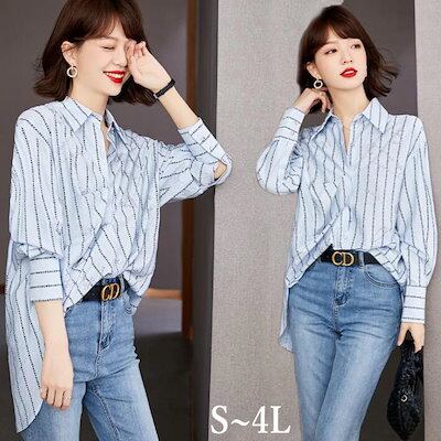 シャツ レディース ブラウス フィッシュテール 前後差 ストライプ トップス 長袖 大きいサイズ 立ち襟 体型カバー ゆったり バルーンスリーブ カジュアル 春夏 S M L 2L 3L 4L今日は3 | DOKO-ME