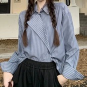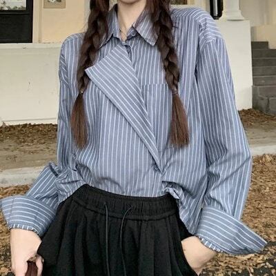 2024春夏トップス シャツ 長袖 ボタン 襟 スタンドカラー ゆったり ストライプ 春 青 白 かわいい おしゃれ 大人っぽい きれいめ カジュアル 韓国ファッション レディース お出かけ安い | DOKO-ME