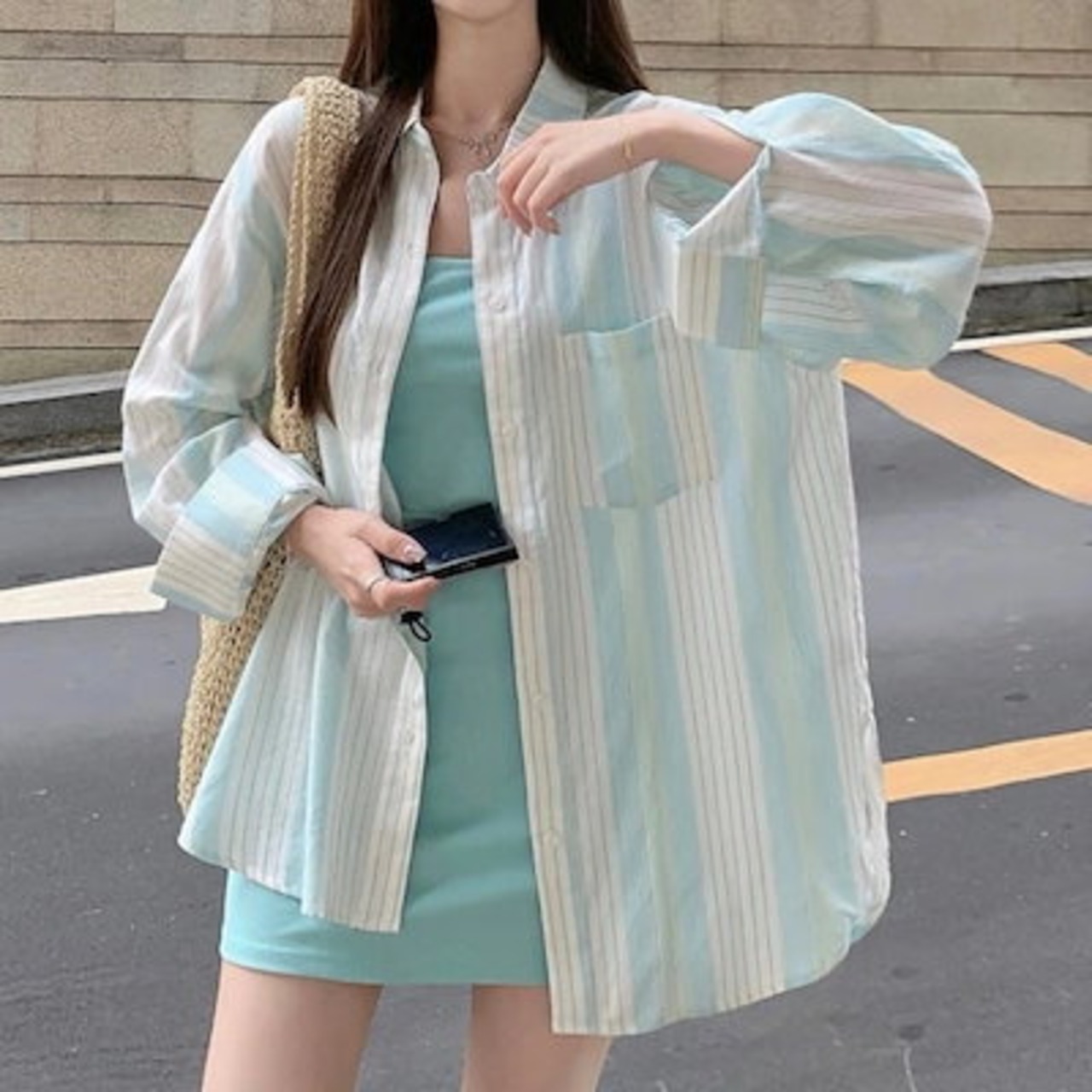 2024 春夏トップス シャツ 長袖 ボタン 襟 スタンダードカラー ストライプ ゆったり 細見え 夏 水色 おしゃれ かわいい カジュアル 韓国ファッション レディース お出かけ安い | DOKO-ME