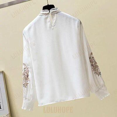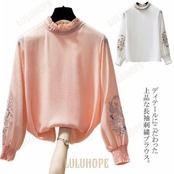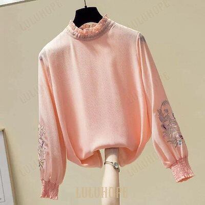 【激安販売】パフスリーブが可愛い ブラウス 刺繍 フリル襟 立ち襟 レディース 長袖 ブラウス シャツ プルシャツ プルオーバー シフォン ブラウス 通勤 オシャレ キレイめ