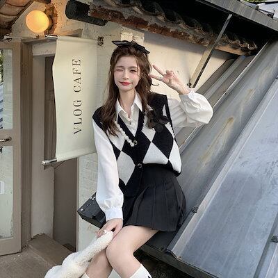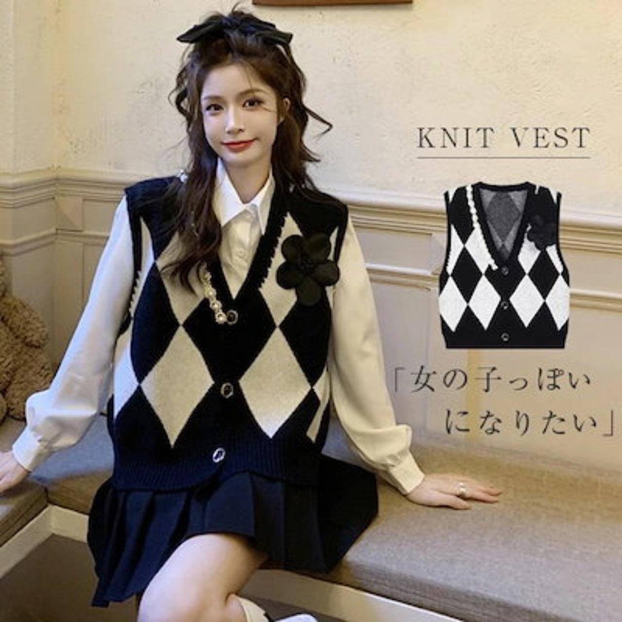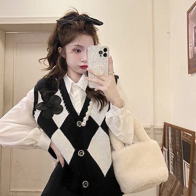 大人可愛いニットベストレディーストップスチェック柄ベストニット前開きカーディガンニットVネックノースリーブ重ね着羽織ゆったりナチュラルボダン付きレイヤードコーデショート丈ガール女の子ゆったり秋冬 | DOKO-ME