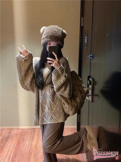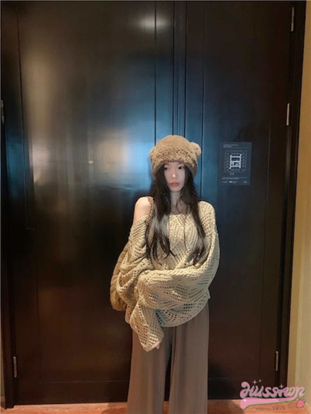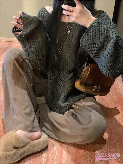 トップス ニット セーター 透かし彫り ラウンドネック プルオーバー 丈長め オーバーサイズ 大きめサイズ 秋 ルーズ 肩出し かわいい おしゃれ カジュアル 韓国ファッション レディース | DOKO-ME