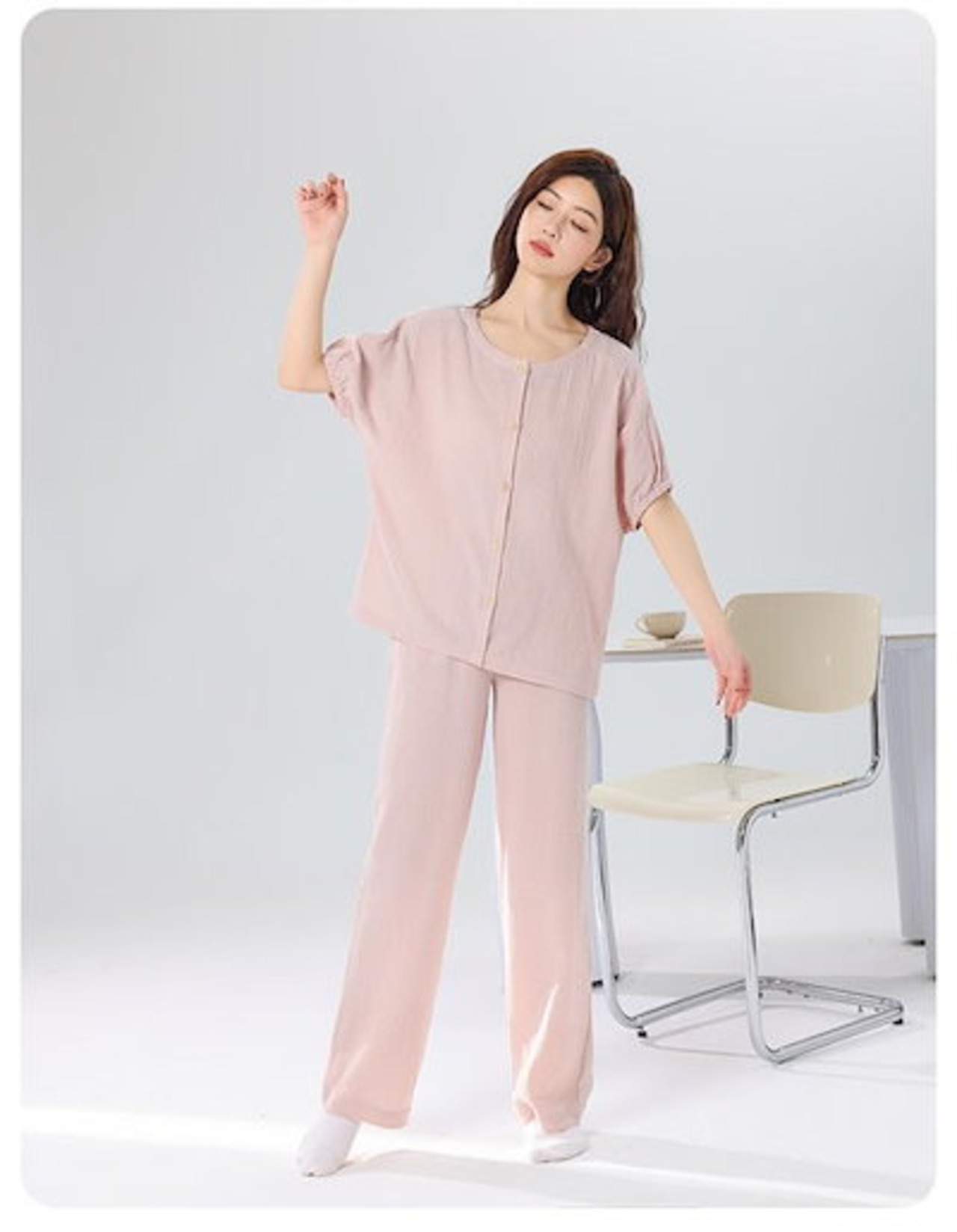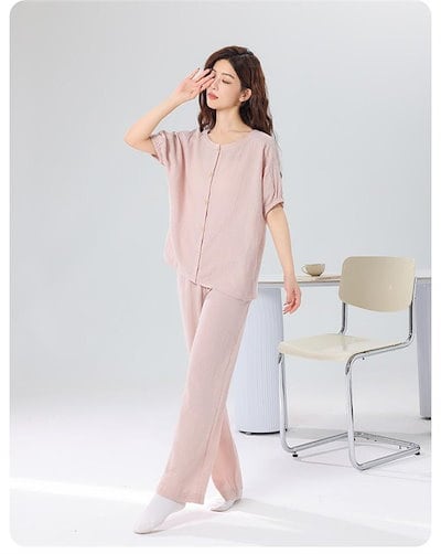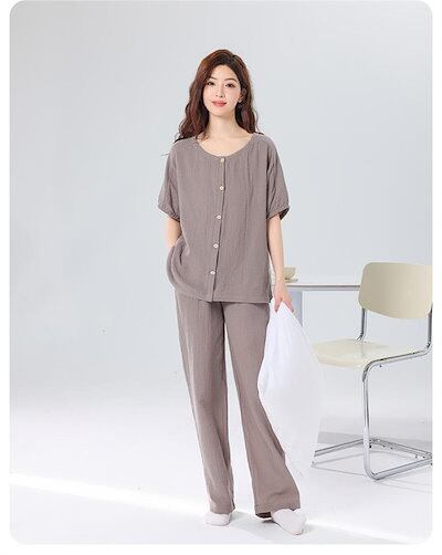 パジャマ 綿100% 2点セット ルームウェア レディース 二重ガーゼパジャマ 綿ガーゼ 上下セット 半袖 前開き ロングパンツ コットン カジュアル 柔らか 春夏秋冬 部屋着 ホームウェア 寝間着 | DOKO-ME