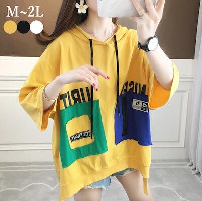 Tシャツ レディース パーカー 半袖 フードVネック スリット ロゴ プリント プルオーバーパーカー トップス ロングT ゆったりTシャツ 大きいサイズ シンプル 夏 M L 2L | DOKO-ME