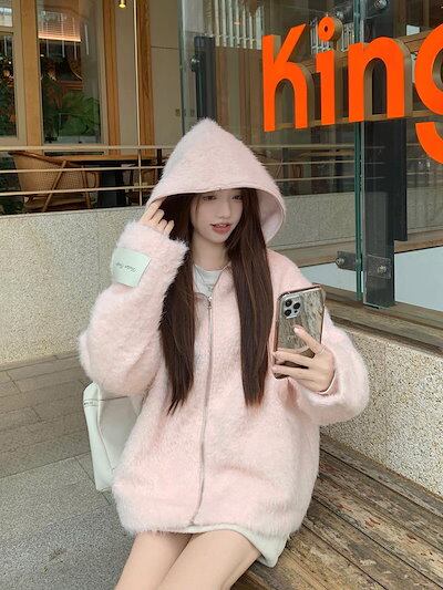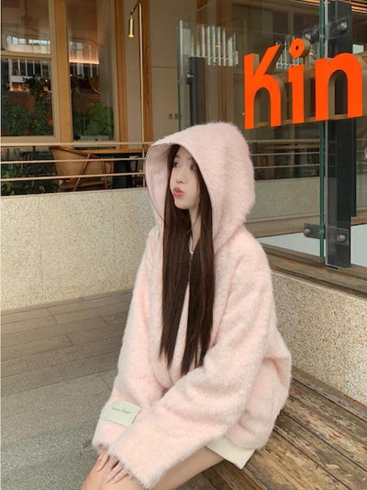 24 厚手 裹起毛 暖かい トップスかわいい パーカー フード付き韓国風長袖ゆったり細見えおしゃれレトロシルエット大人っぽ韓国フルサイズファッション系ルーズレディースサイド学生通学羽織り | DOKO-ME
