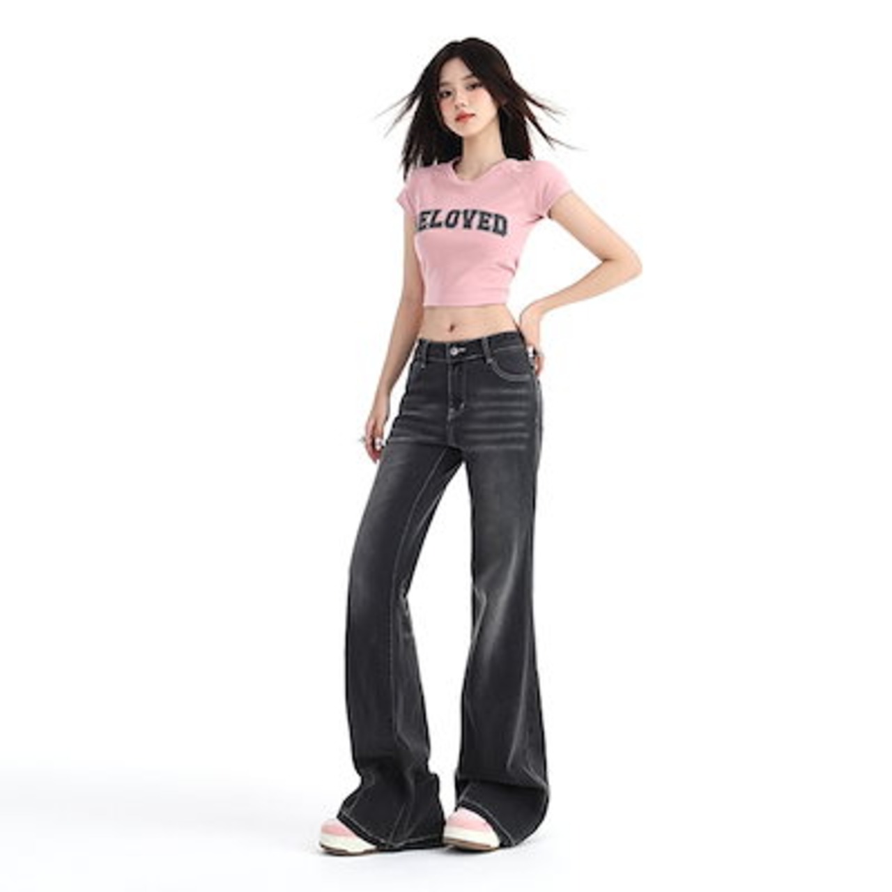 グラファイトグレーのゆるいストレッチマイクロフレアジーンズレディース2024春夏新作ワイドレッグパンツ
