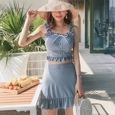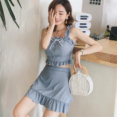 水着 レディース 体型カバー 水着3点セット フレアスカート 三角パンツ 小胸バンドゥビギニ 水着