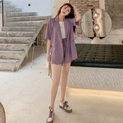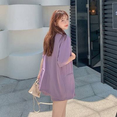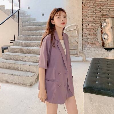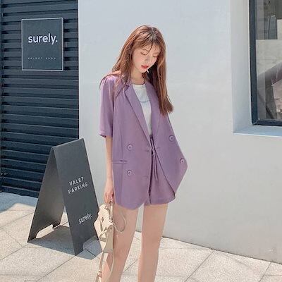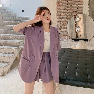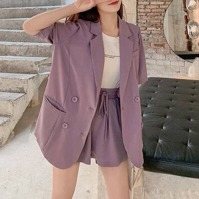 スーツセットアップレディース半袖ジャケットショートパンツ上下セットツーピースロングダブルボタンハイウエストフレアレトロかわいいかっこいいおしゃれSMLXL黒ブラック紫パープルオレンジ大人夏 | DOKO-ME