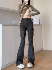 グレーのフレアパンツレディース春秋の新作アメリカンレトロ着やせ見えハイウエストマイクロラッフルデニム馬蹄ロングパンツ