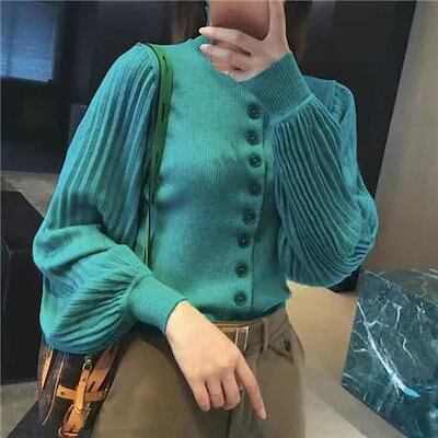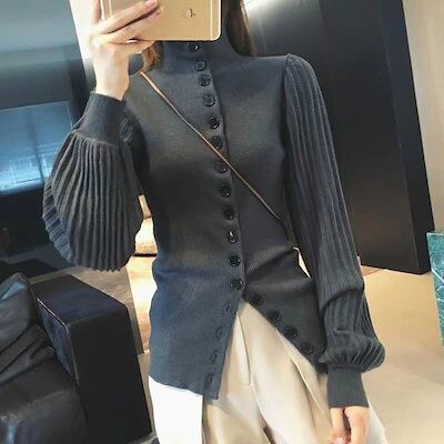 ニットトップス レディース 40代 長袖トップス パフスリーブ 無地ニットインナー ショット丈ニットソー プルオーバー ゆったりセーター 大人 オシャレ
