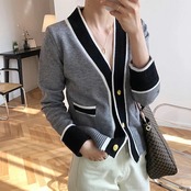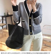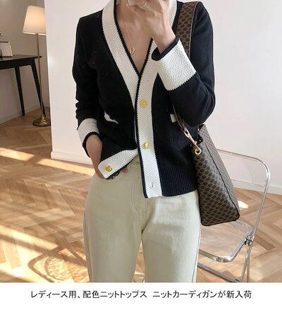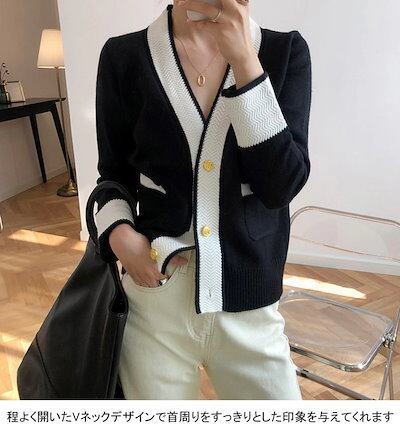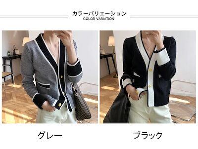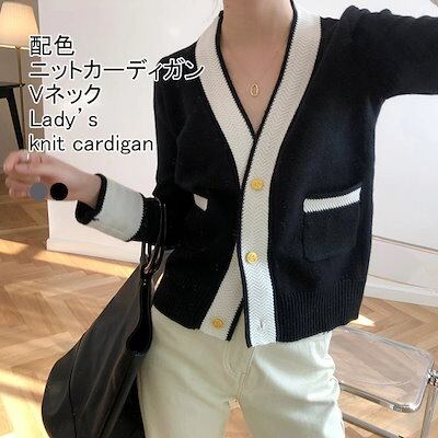 ニットカーディガン レディース アウター 無地 Vネック 長袖 前開き 配色 トップス カジュアル ボタン付き ポケット付き 柔らかい ゆったり 着回し シンプル 大人可愛い 出掛け 秋冬 普段着 通 | DOKO-ME