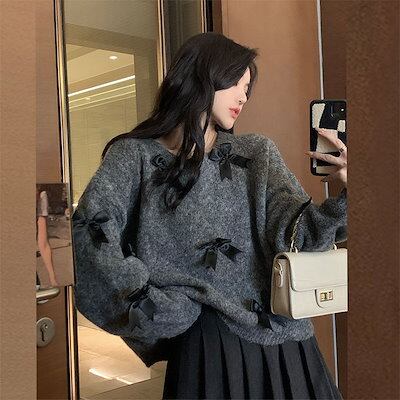 グレー リボン 長袖ニット 韓国 ゆったり カジュアル セーター プルオーバー 秋冬新作 レディース ニットトップス カットソー