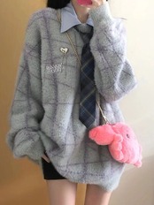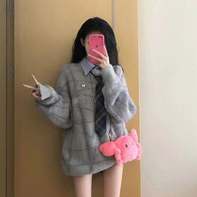 怠惰風 ラウンドネックセーター チェック 長袖ニット レディースファッション ゆったり ニットトップス プルオーバー