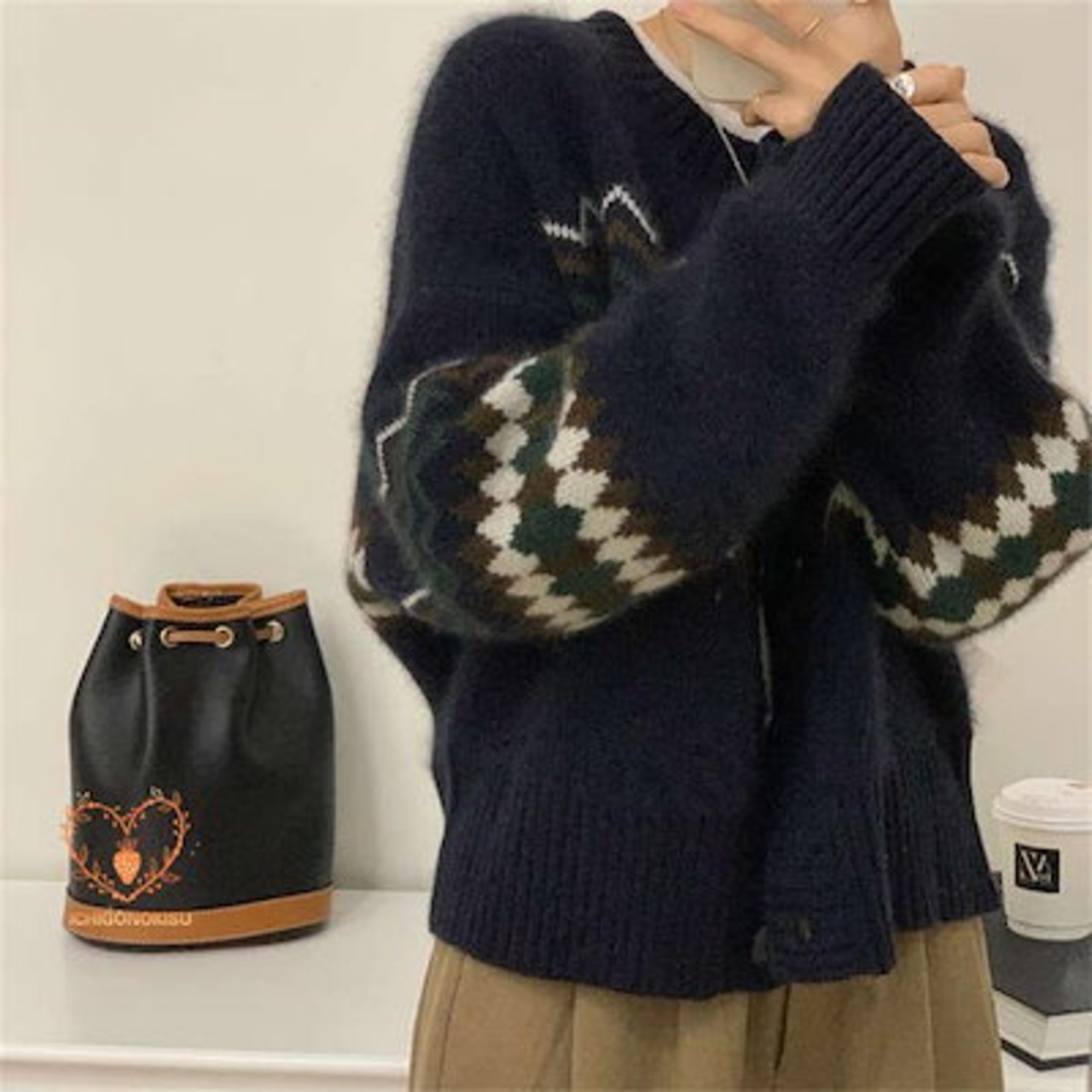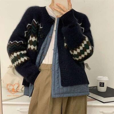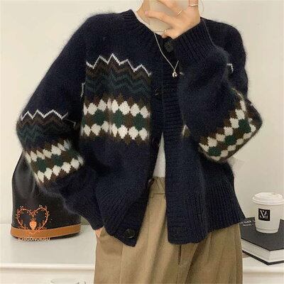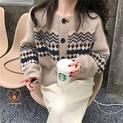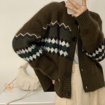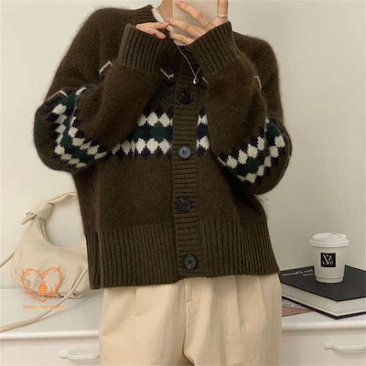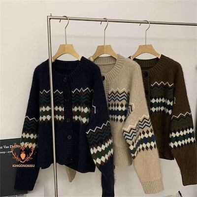 【beifengzh 0 ng】新作ニットカーディガン レディース 長袖 秋 冬 カーディガン 幾何柄 セーター ゆったり 厚手 丸首 ニットトップス ショット丈 もこもこ アーガイル | DOKO-ME