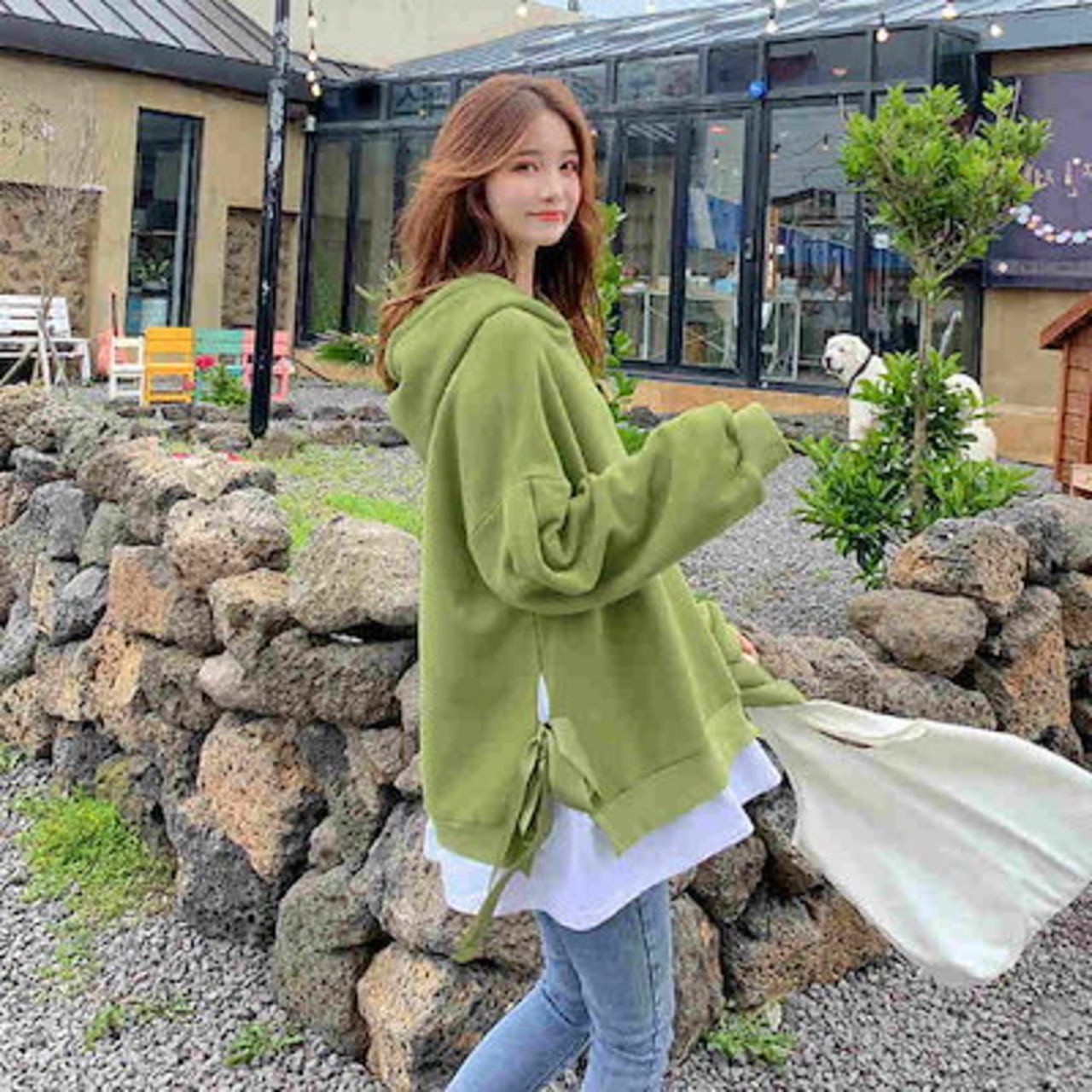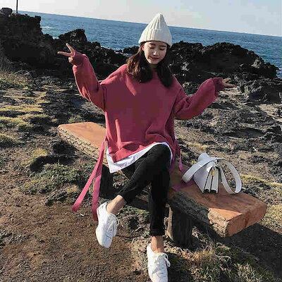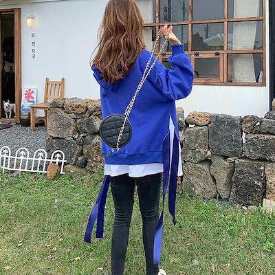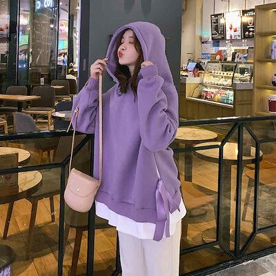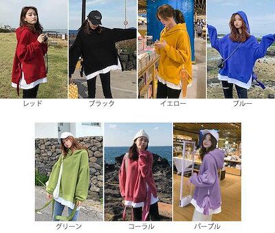 レディース パーカー プルオーバー フード付き スリット オーバーサイズ ゆったり 大きめ トレーナー 長袖 トップス カジュアル 可愛い りぼん おしゃれ レッド ブラック イエロー ブルー | DOKO-ME