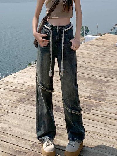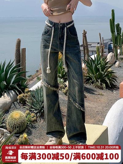 古いバリのパッチワークジーンズを作る女性のハイウエストでゆったりとした着やせデザイン感ストレートの狭版モップパンツブーム