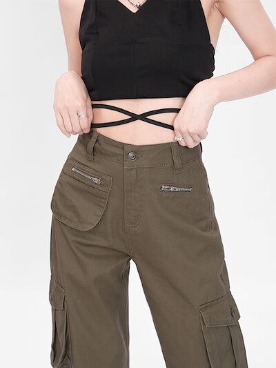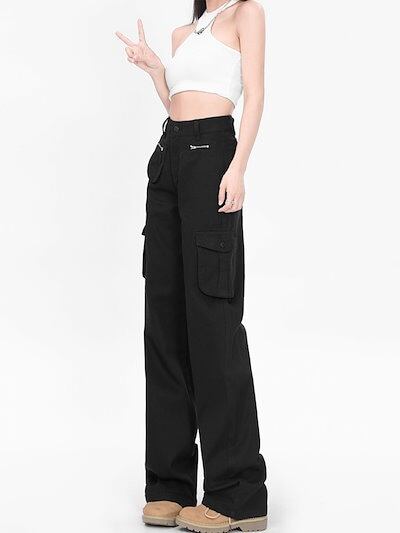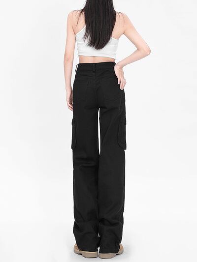 アメリカンブラックパンツレディース秋冬新作マルチポケットデザイン感ハイウエストスリムストレートワイドデニムパンツ