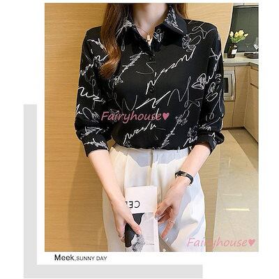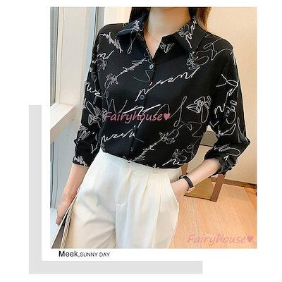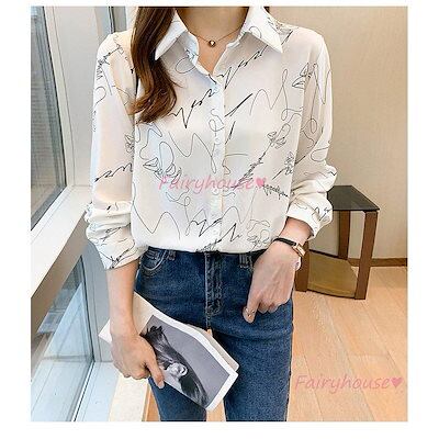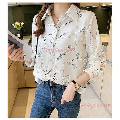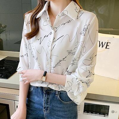 ブラウス レディース 長袖ブラウス 秋 オフィスブラウス プリント 折り襟 オシャレブラウス 白トップス 韓国風 大人 通勤OL ゆったりシャツ40代 30代 50代