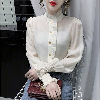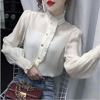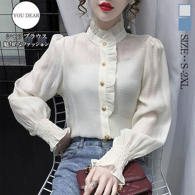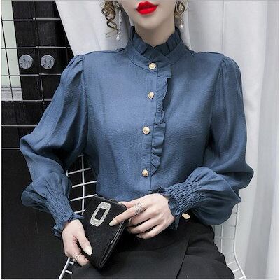 シャツブラウス ブラウス レディース 長袖 シャツ トップス ハイネック フリル ゆったり カジュアル 折り襟 大きいサイズ 着痩せ 春 オフィス 30代 40代