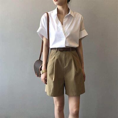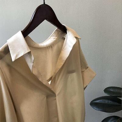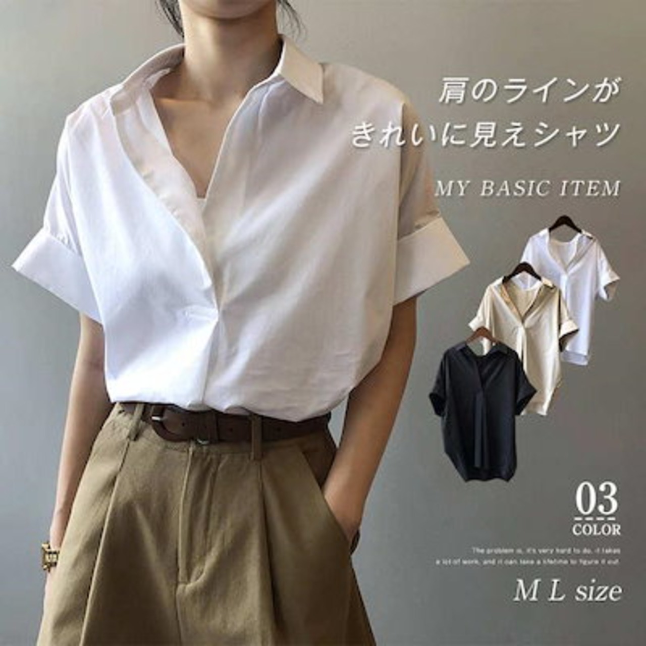 シャツ 半袖 レディース 夏 ブラウス フレンチスリーブ オフィス 白シャツ 黒シャツ 折り襟 薄手 vネック トップス プルオーバー 大人 ビジネス 通勤