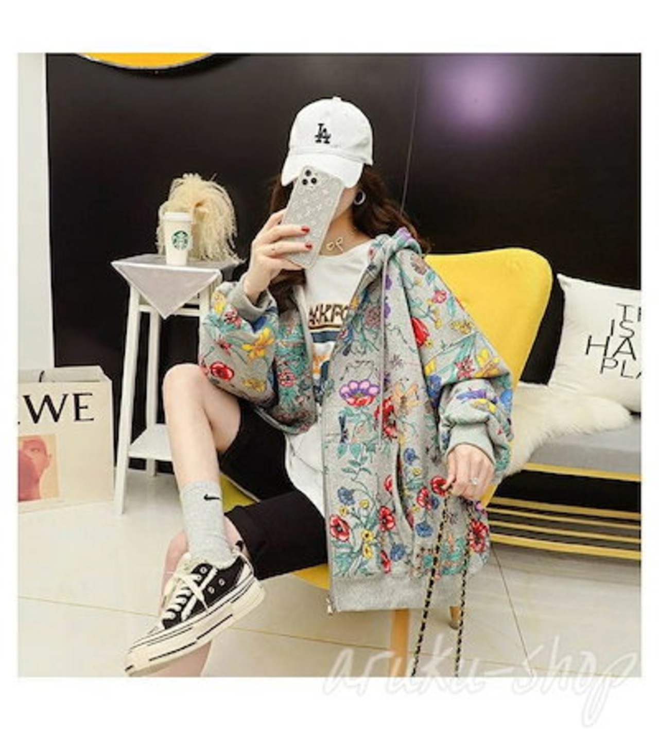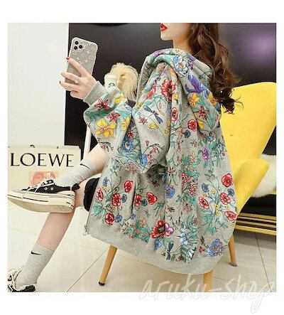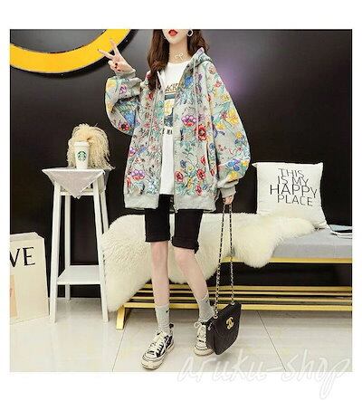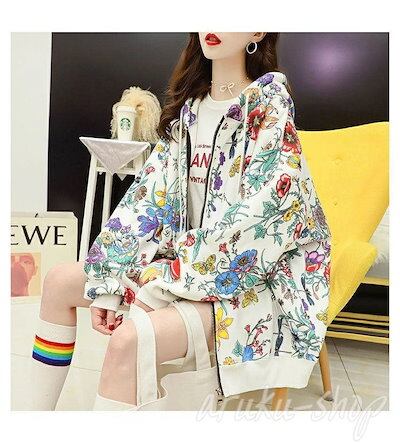 3色 パーカー レディース ルーズ フード付き トップス 長袖 おしゃれ ジップアップ 花柄 カジュアル 可愛い ラフ ゆったり こなれ感 XL 2XL 3XL コーデ 通学 学生 通勤 白 黒 グレ | DOKO-ME