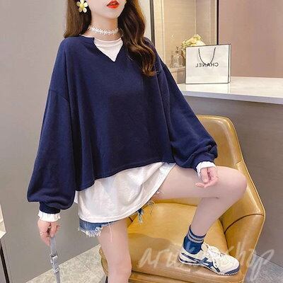ゆったり ゆるパーカー 長袖 トレーナー レイヤード 重ね着風 切り替えパーカー プルパーカー レディース パーカー