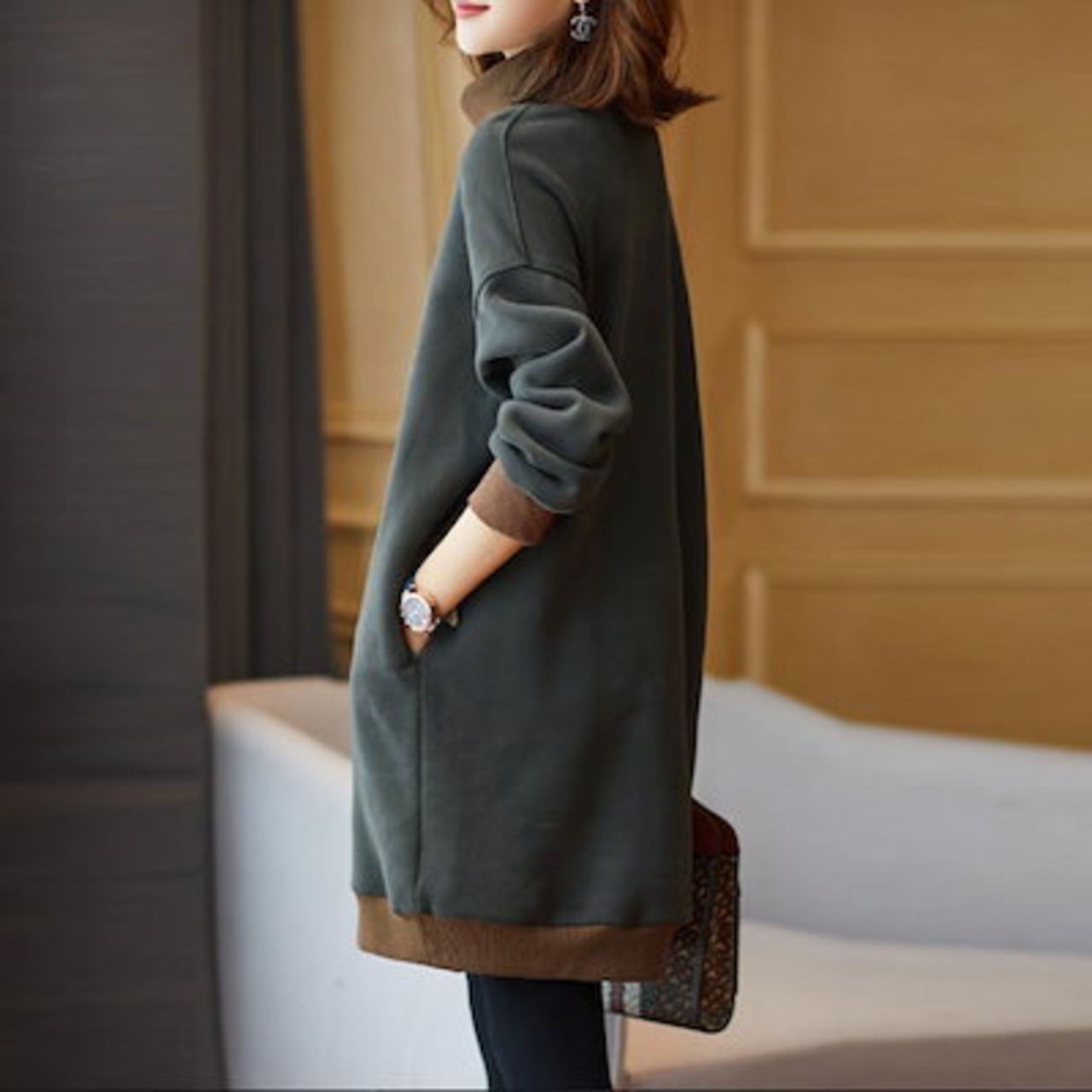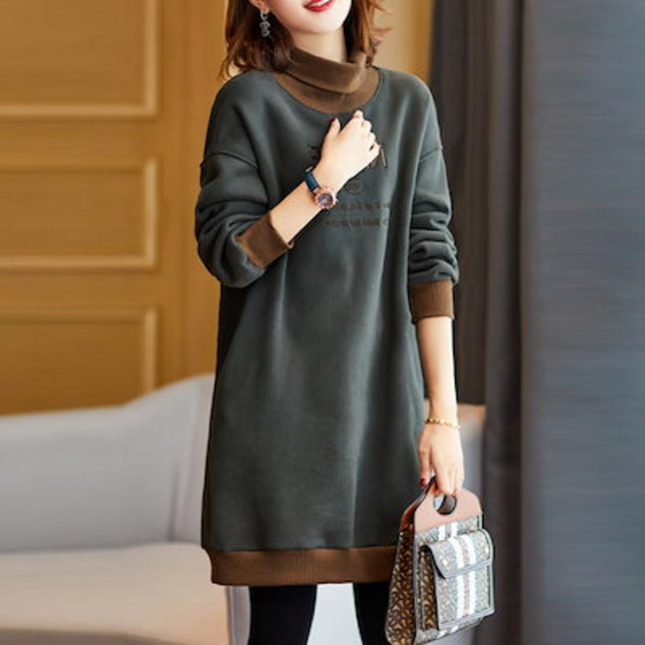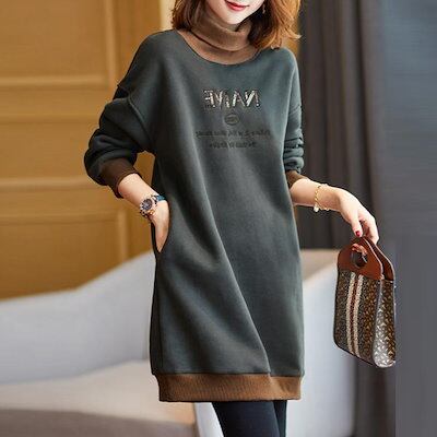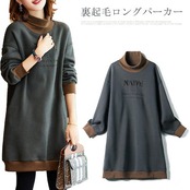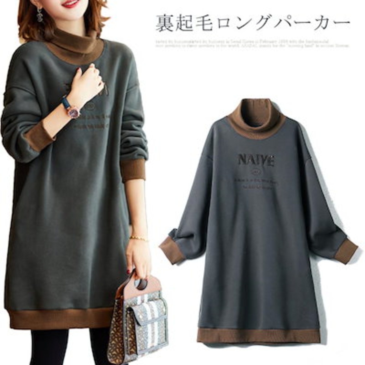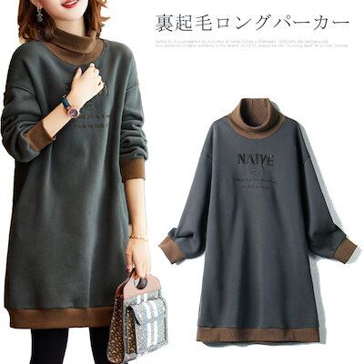 プルーオーバー 英字刺繍 レディース 長袖 ポケット 重ね着風 体型カバー レイヤード風 トップス パーカー ロング丈パーカー ハイネック 裏起毛 タートルネック 切り替え 重ね着風 weiyi-26 | DOKO-ME