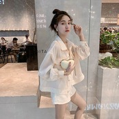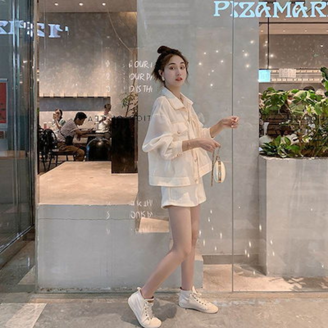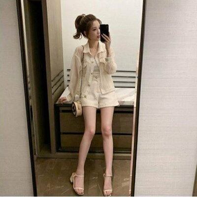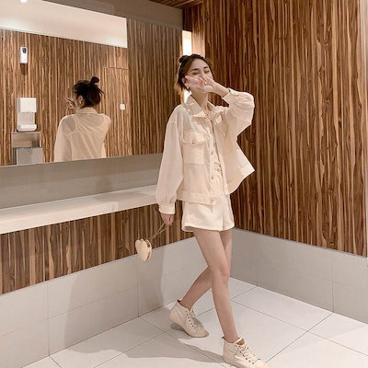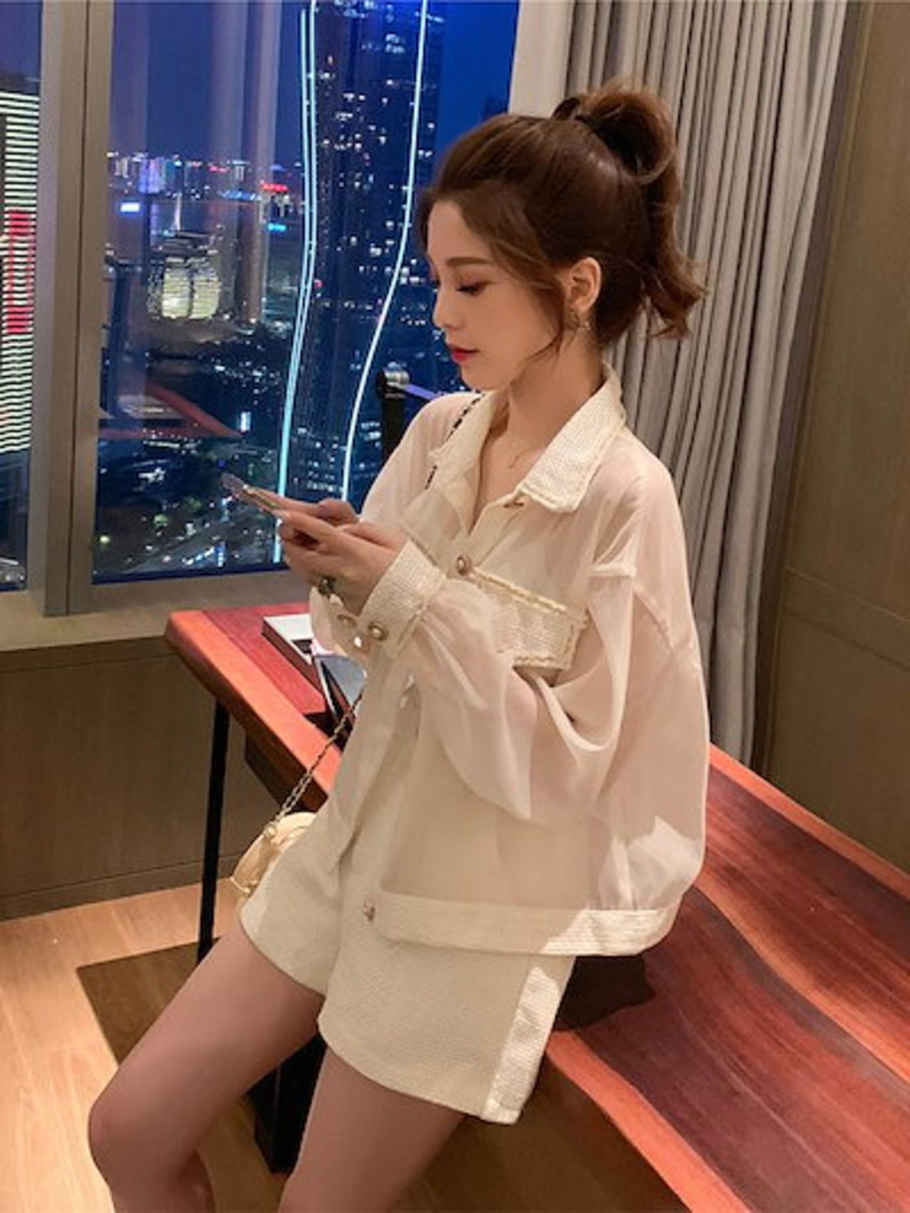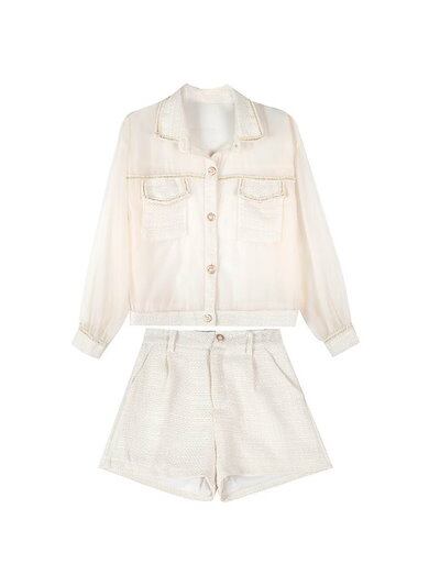 セットアップ スーツ フォーマル ホワイト系 アプリコット タック キュロットパンツ 透け感 シアー ブラウス シフォン ツイード 切り替え ショートパンツ かっこいい レディース 上下セット カジュ | DOKO-ME