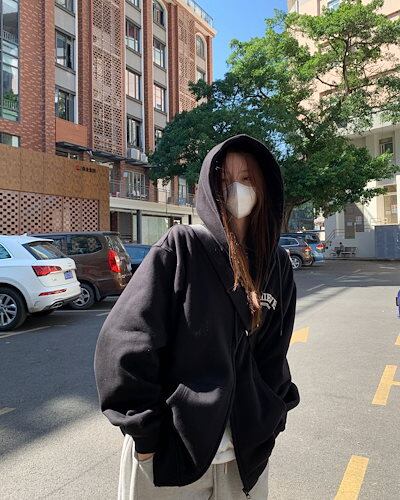 グレーのファスナーカーディガンハットパーカーレディース春カジュアルファッションゆったり気だるい風前後プリントコート