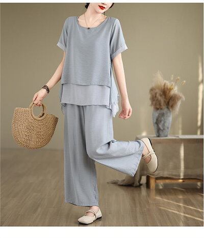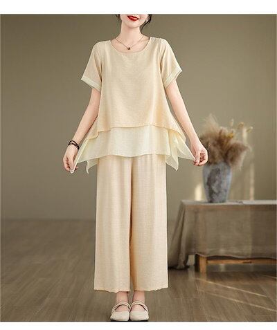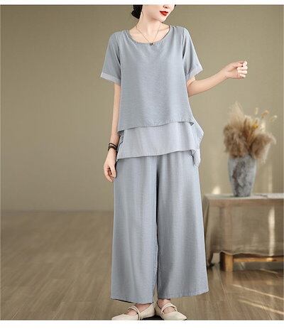 セットアップ 夏 レディース 綿麻風 2点セット フレア 上下セット チュニック Tシャツ& ワイドパンツ 半袖 バギーパンツ イージー フレアパンツ 涼しい カジュアル ナチュラル 大きいサイ | DOKO-ME