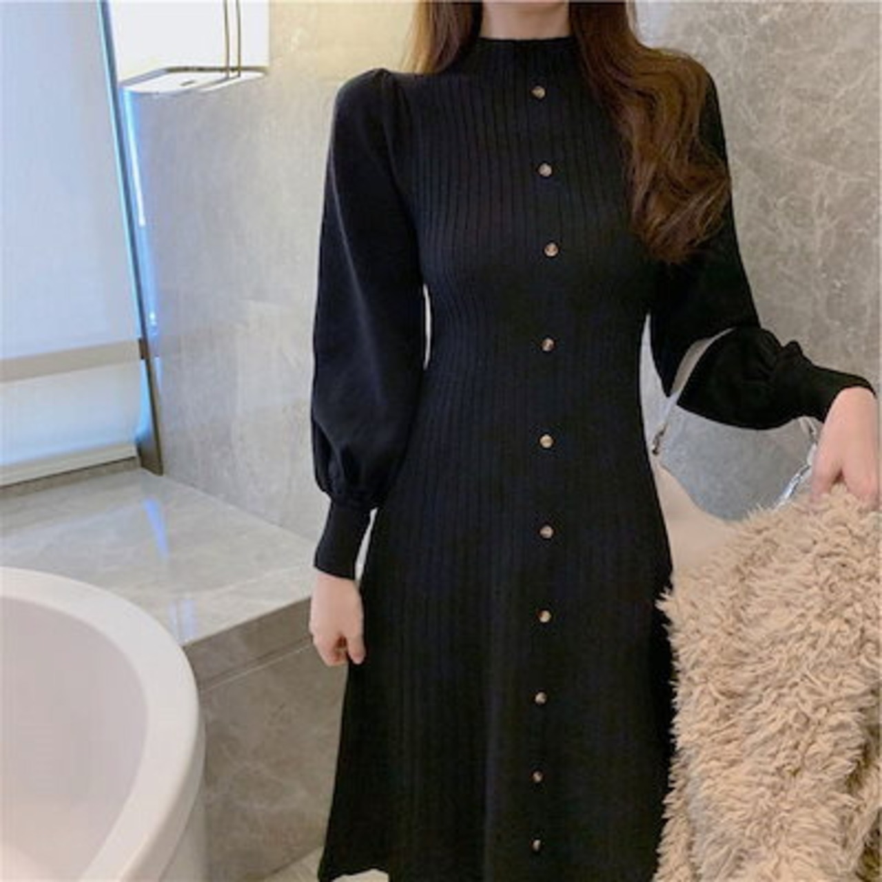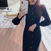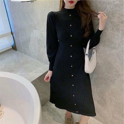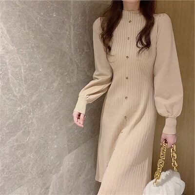 セーター ニット ロングニット あったかい 無地 ニット レディース タイト ニットワンピース 大きいサイズ 冬物 リブニット カットソー インナー 長袖 冬 膝下 秋冬 パフスリーブ ロングワンピー | DOKO-ME
