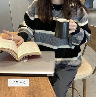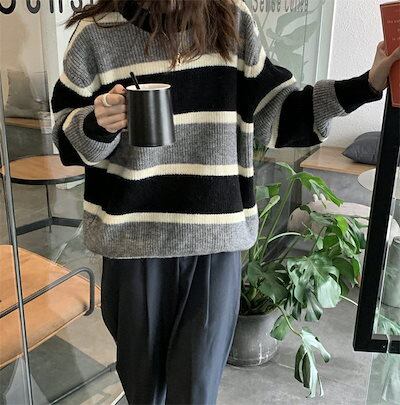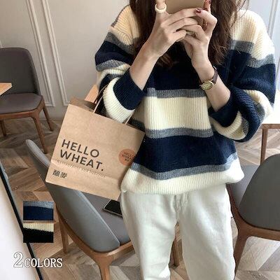 オーバーサイズ お洒落 ニットセーター 可愛い リラックス ボーダー柄 通学 セーター 冬 チュニック レディース 配色 ドルマン 通勤 秋冬 セーター トップス アウター ニットソー プルオーバー | DOKO-ME