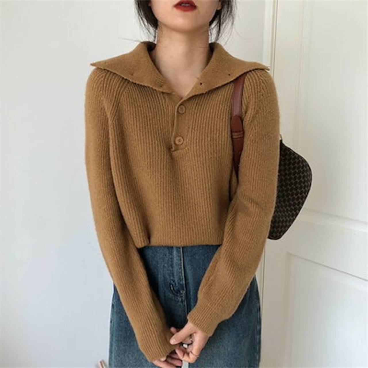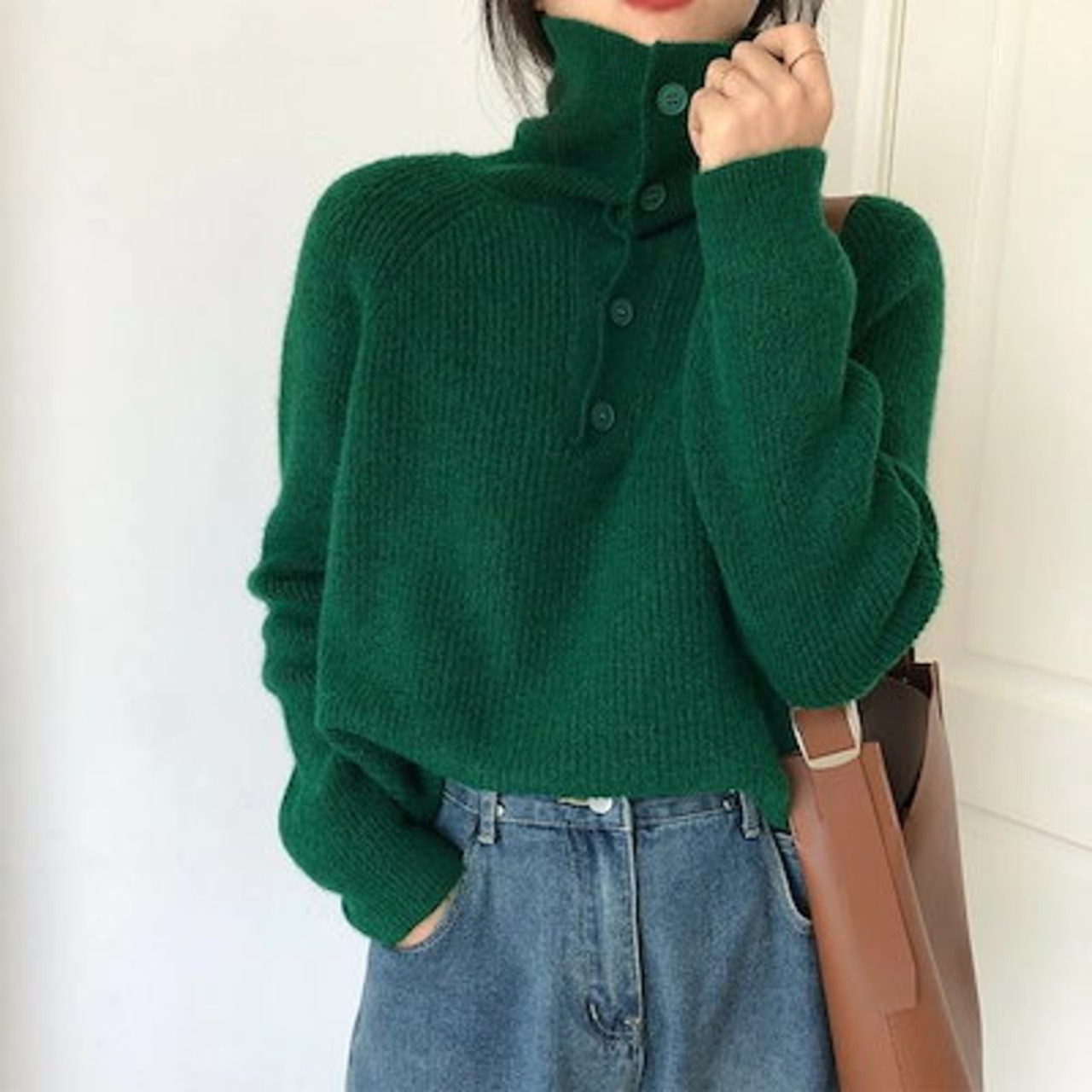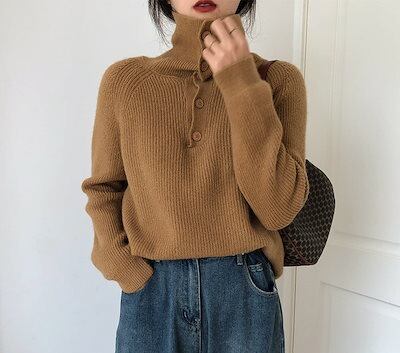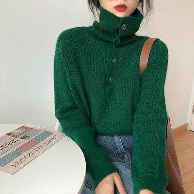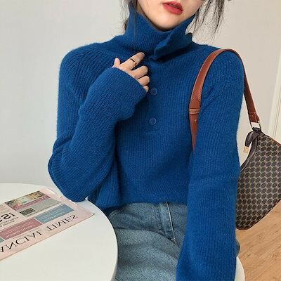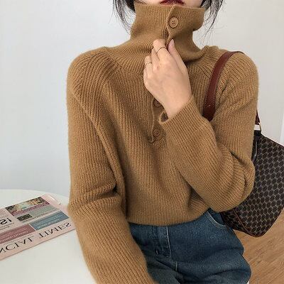 ボタン留め 無地 ハイネックセーター デザイン ブラウス スタンドネック お洒落 カジュアル風 通勤 レディース アウター ニットソー 長袖 秋冬 インナー 通学 ニットセーター プルオーバー ニット | DOKO-ME