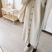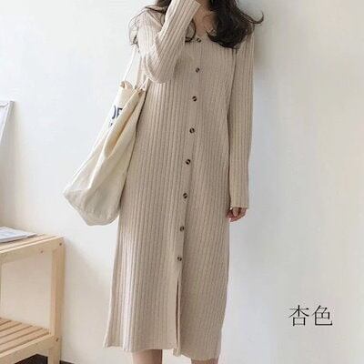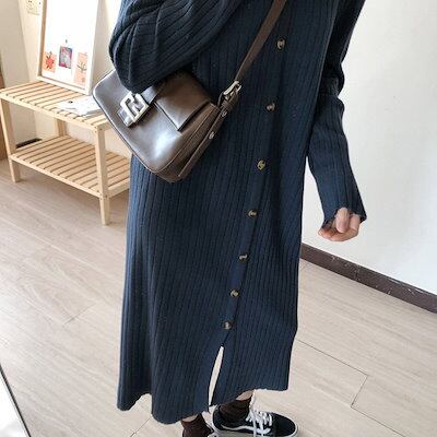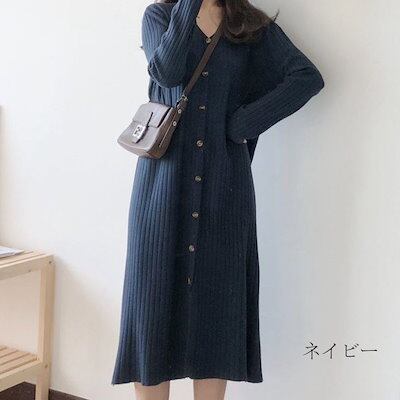 ニットワンピース ニットワンピ Vネック レディース 秋冬 ロングカーディガン ロングワンピ 前開き 長袖 ロング丈 トップス 薄手ニット ボタン留め 柔らか カジュアル シンプル 無地 黒 ネイビ | DOKO-ME