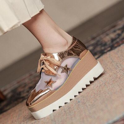 レディース厚底スニーカーウェッジソール靴レディースメッシュシューズヒール8cm厚底スニーカーレースアップインヒールスニーカーパンプスオックスフォードブラックベージュ厚底ローファー靴韓国星柄 | DOKO-ME