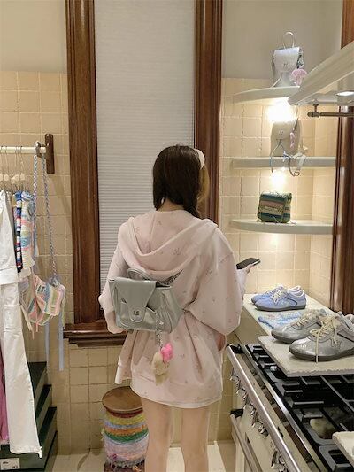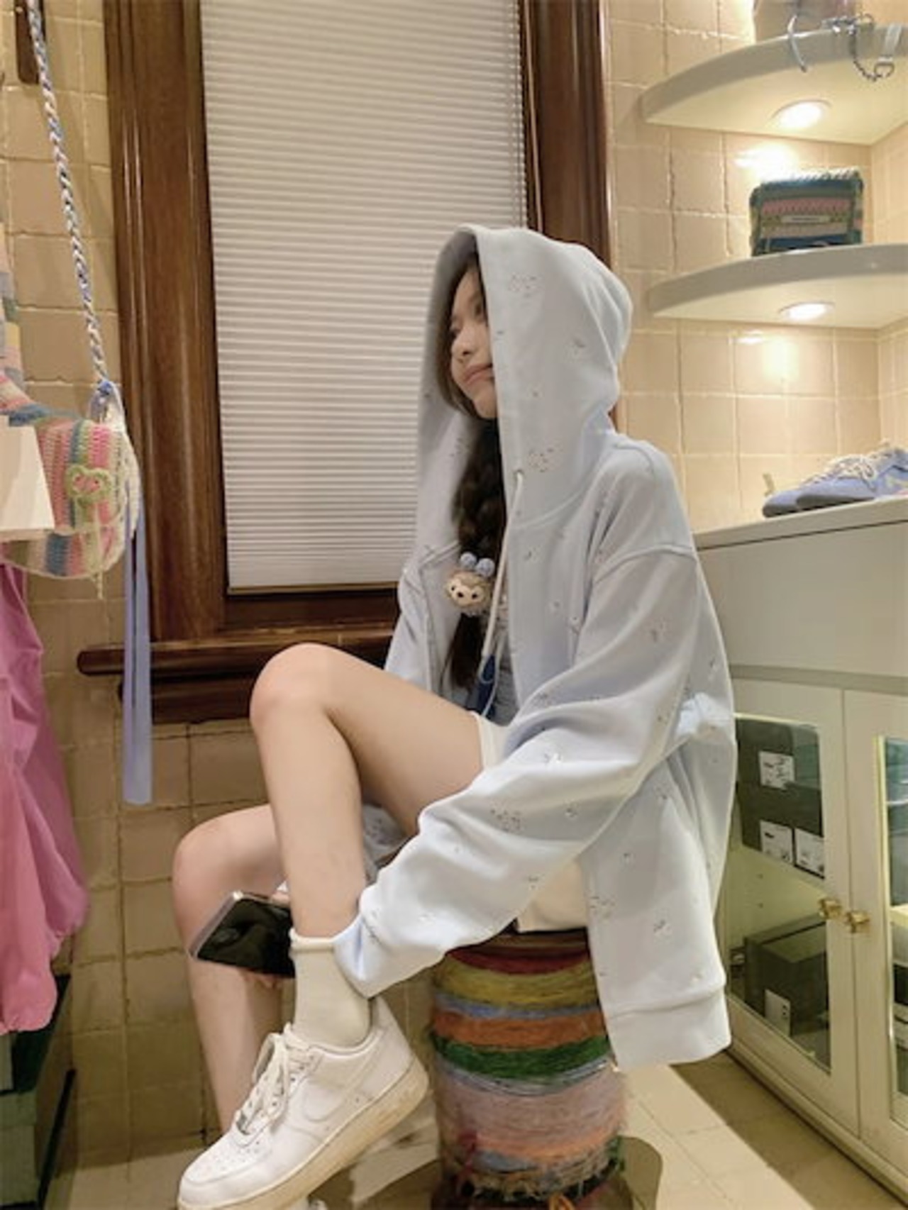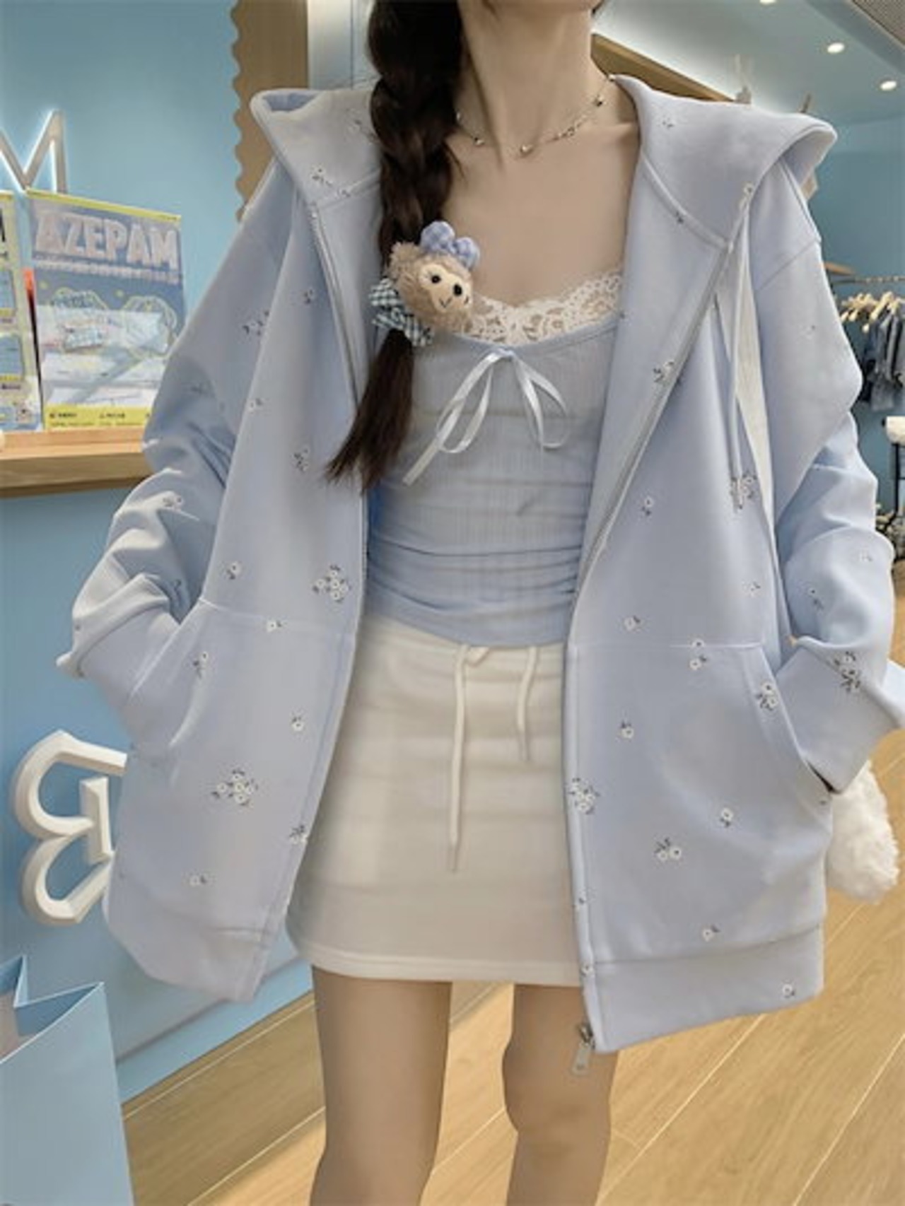 秋冬トップス パーカー フード付き ジップ チャック 長袖 花柄 ポケット 大きめサイズ ゆったり 細見え 秋 水色 おしゃれ かわいい ガーリー キュート 甘め 韓国ファッション レディー | DOKO-ME