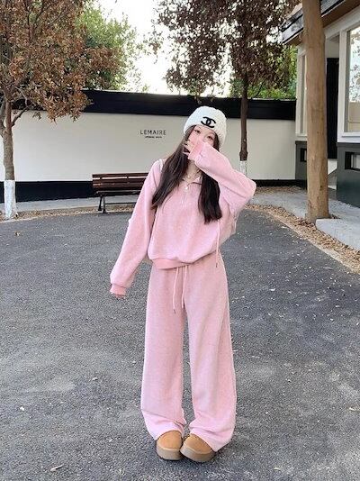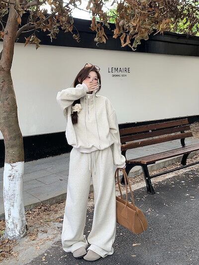 2024 秋冬 韓国 かわいい レディース 厚手裹起毛無地 長袖アウターレトロセット黑白上下ハーフサイズ丈トップス春カジュアルスポーツファッション系通学学生袖お出かけアップシルエットトラック羽織 | DOKO-ME