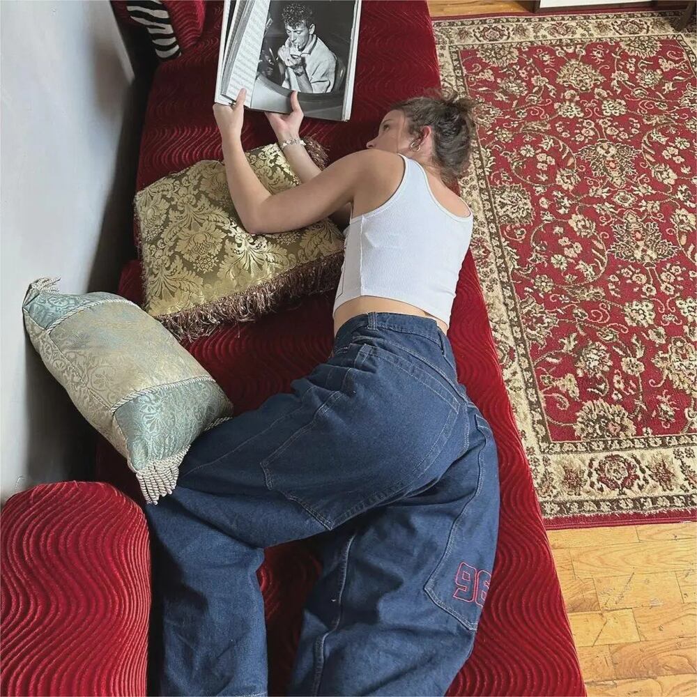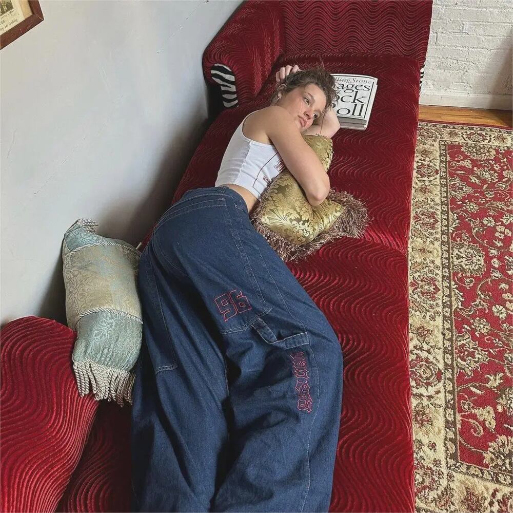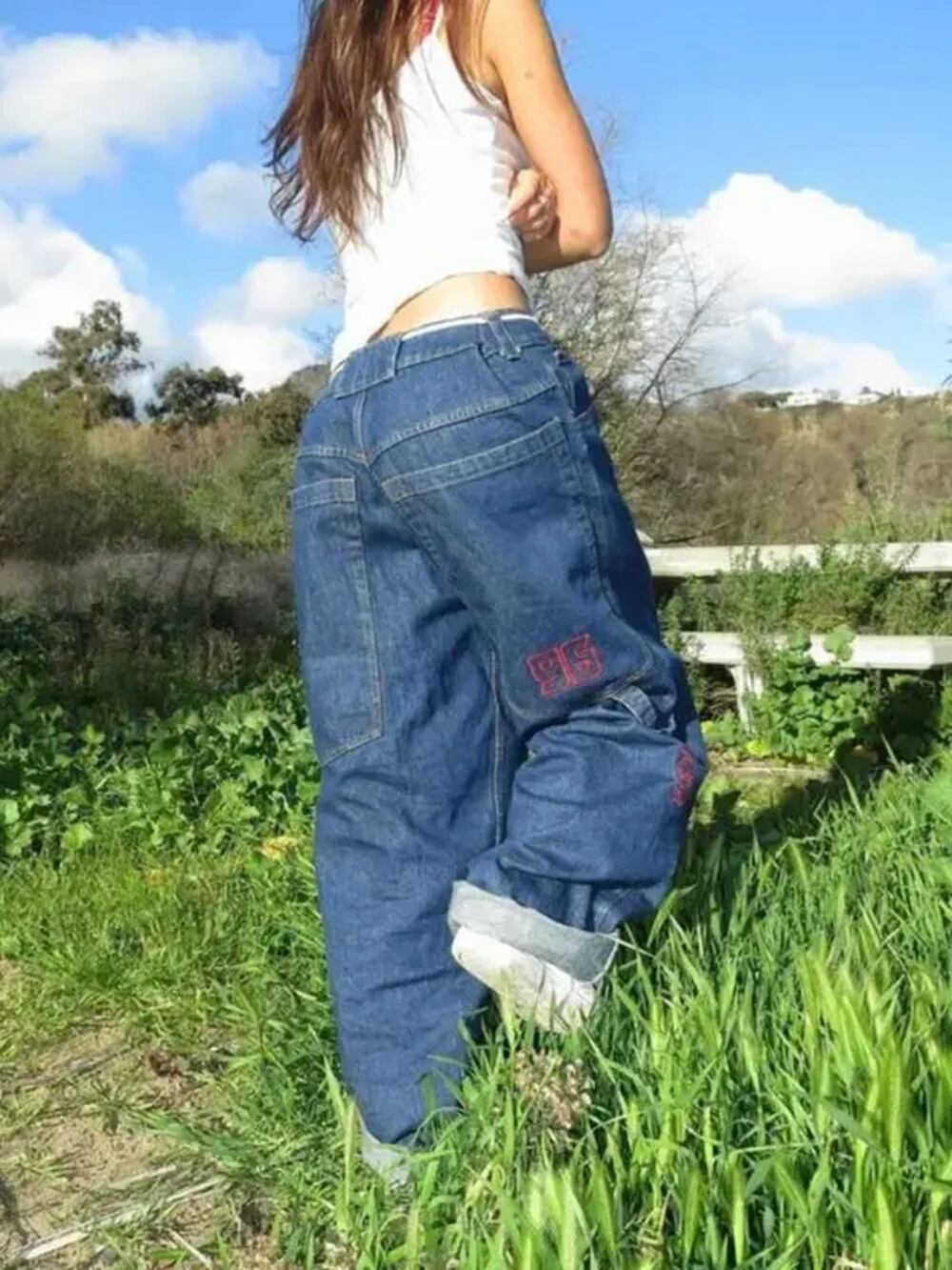 女性用ラージポケットブルージーンズ,バギーブルーパンツ,カジュアル,ファッショナブル,ハイウエスト,レタリングパターン,原宿,ワイドレッグ,ストレートパンツ y2k ボトムス T240901114541_01 | DOKO-ME