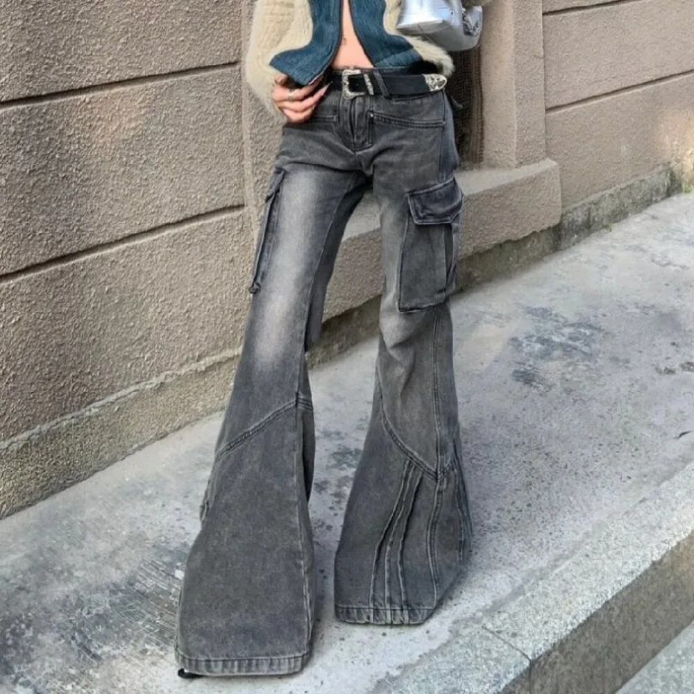 女性の個性的なポケットデザインバギーカーゴパンツ、アメリカのローウエストのワークウェア、ヴィンテージウェア、ゆったりとしたアーティスト、ストレートレッグ、flared y2k ボトムス T240901121327_01 | DOKO-ME