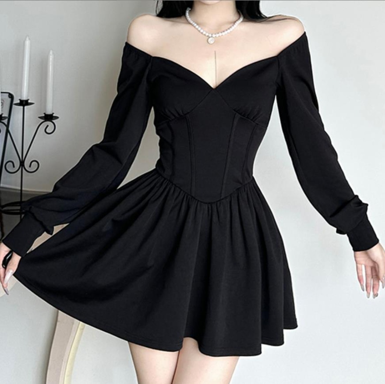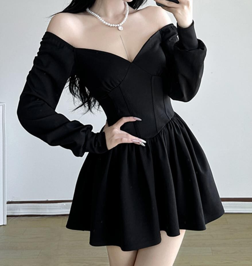 2024秋冬新作 女 レディース ハイウエスト 長袖 Vネック ベロア ミニ ワンピース ドレス 台型スカート