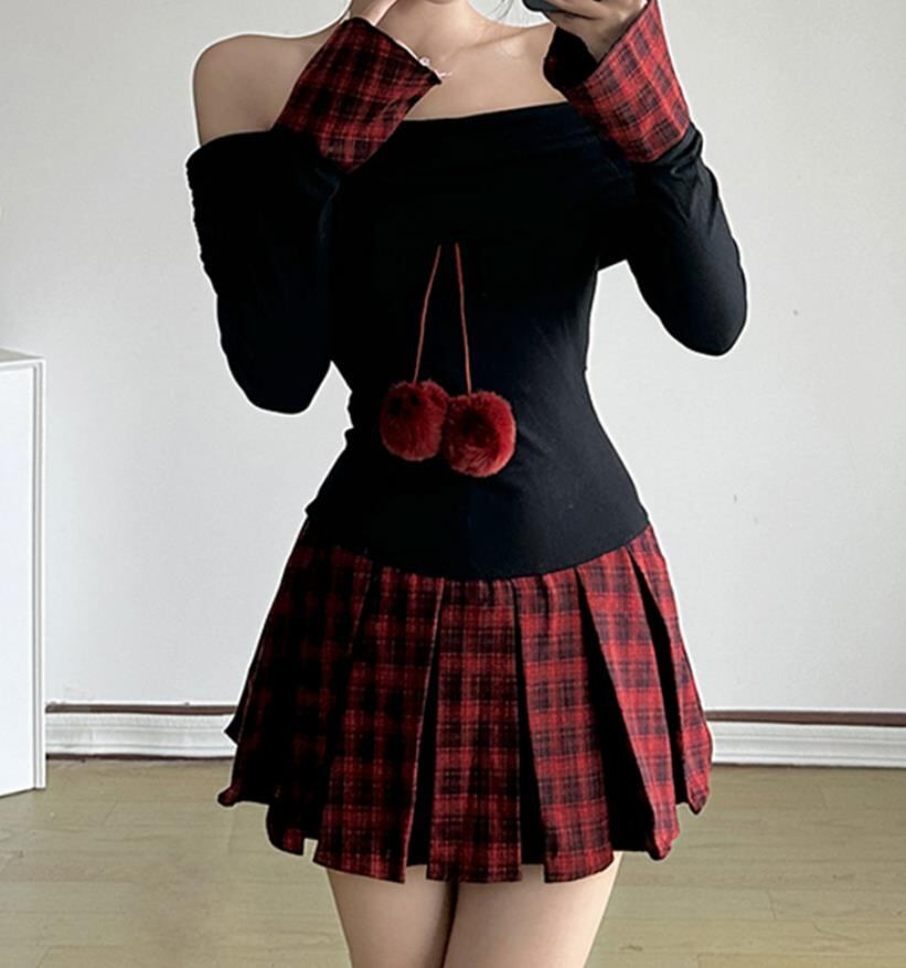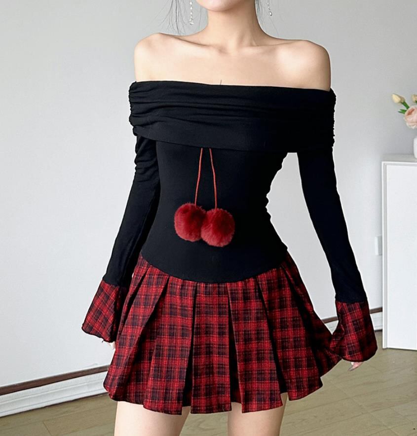 2024秋冬新作 女 レディース ハイウエスト ボートネック 長袖 ミニ ワンピース ドレス プリーツスカート