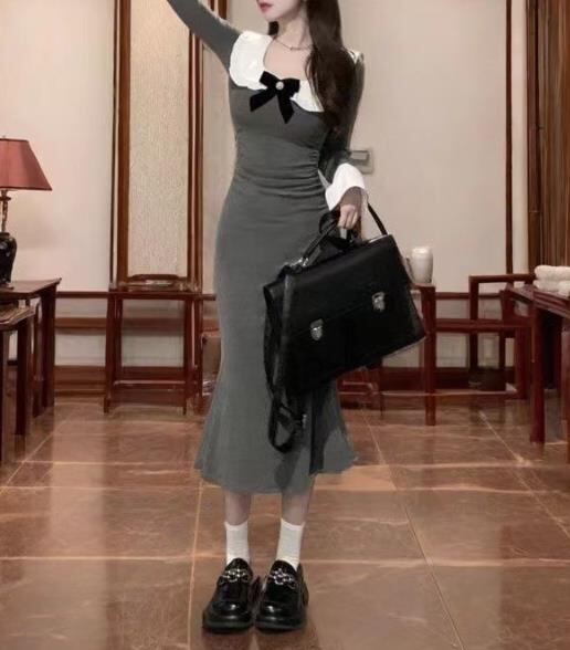 2024秋冬新作 女 レディース ハイウエスト 長袖 ロング ワンピース タイトスカート