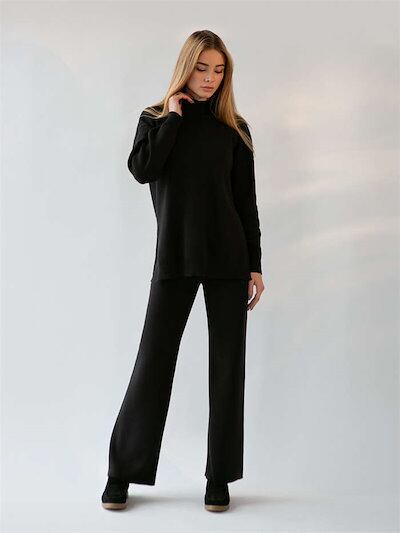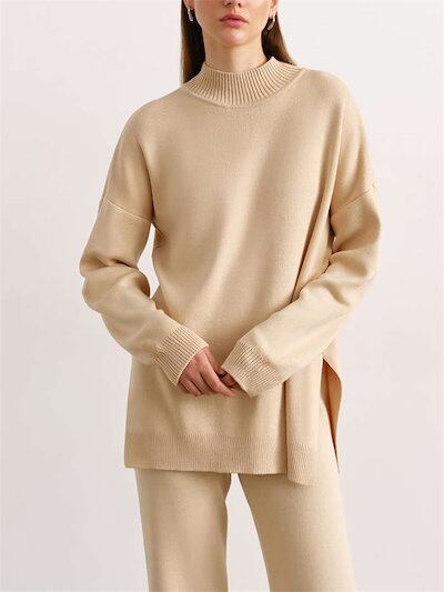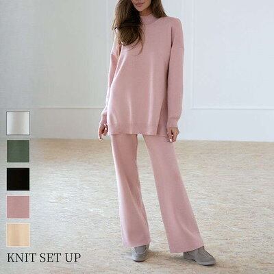 ニットセットアップ レディース リブ ハイネック セーター スリット入り パンツスーツ 長袖 秋 冬 春 ロング丈 ロングパンツ リブセット 2点セット 上下セット 無地 厚手 パンツ トップス きれ | DOKO-ME