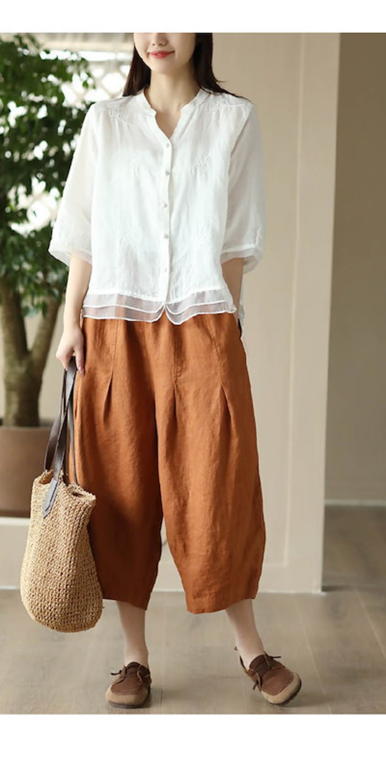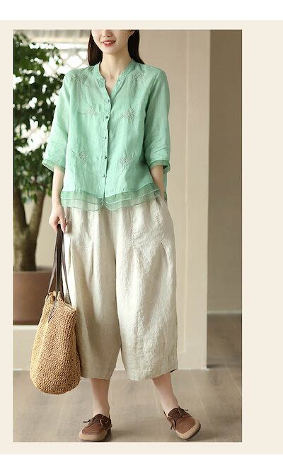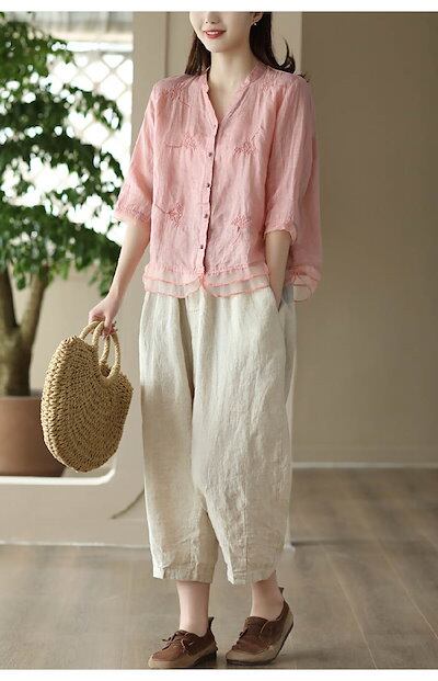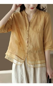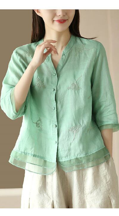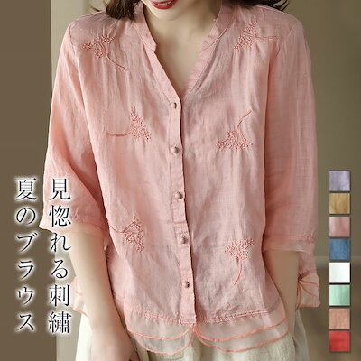 シャツ ブラウス レディース 花柄 刺? 半袖 春 夏 秋 Vネック トップス シャツ ナチュラル リネン フェミニン 着回し シンプル おしゃれ 大人 カジュアル こなれ感 ゆったり ボリューム感 | DOKO-ME