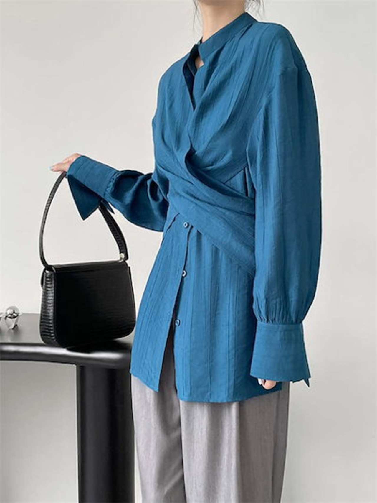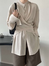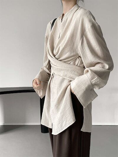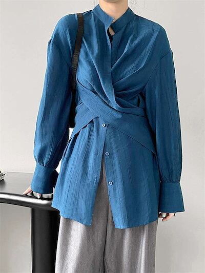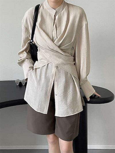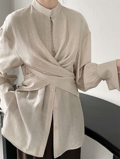シャツ ブラウン 長袖 バンドカラー チュニック レディース トップス 夏 秋 春 無地 長袖 ゆったり オシャレ デザイン シンプル カジュアル 着回し 華奢見え 体型カバー ゆったり 上品 トレン | DOKO-ME